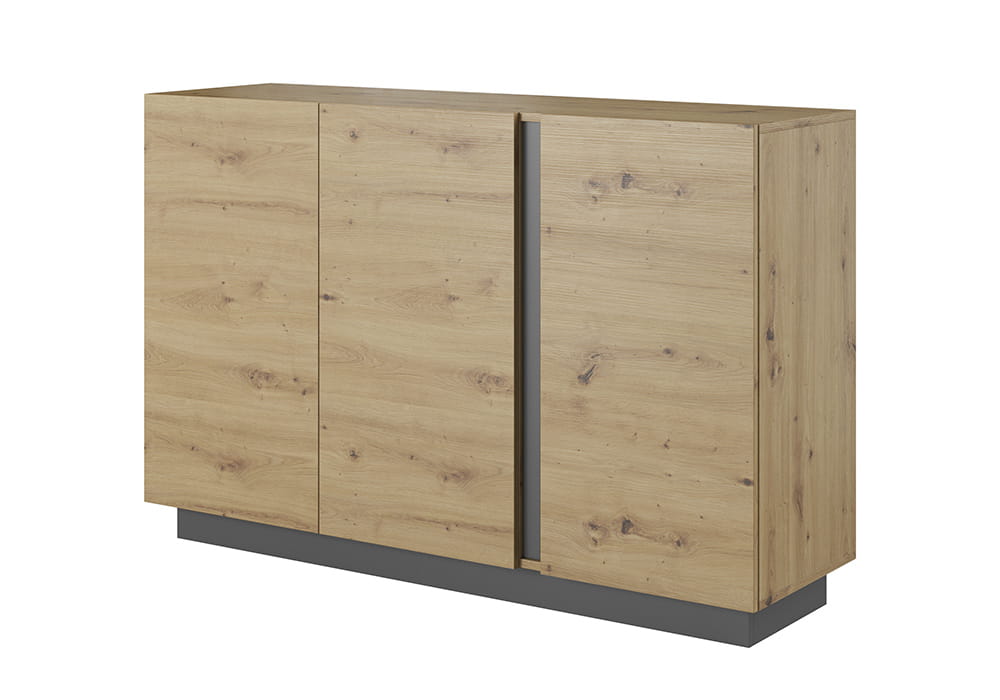 meble w prostej bryle i kompozycji, ozdobione dekorami w kolorze grafitu lub dębu grandson. Kolekcja w dwóch wybarwieniach ciepłym artisanie lub śnieżnobiałym białym połysku.