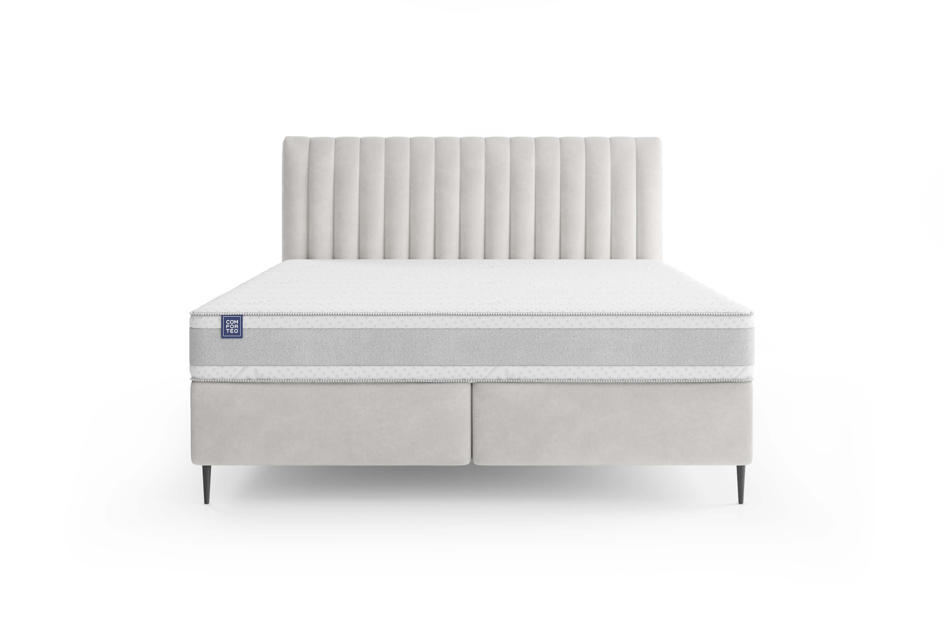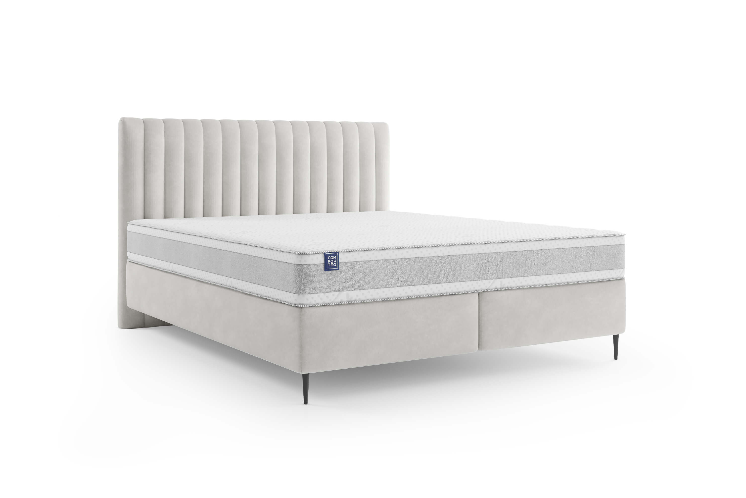 Wysoki zagłówek z gęstymi, pionowymi przeszyciami nadaje łóżku eleganckiego wyrazu, podkreślając jego wyrazistość i styl. Czarne nóżki o wysokości 12 cm dodają lekkości całej konstrukcji, jednocześnie ułatwiając utrzymanie czystości pod łóżkiem, nawet przy użyciu robota sprzątającego.