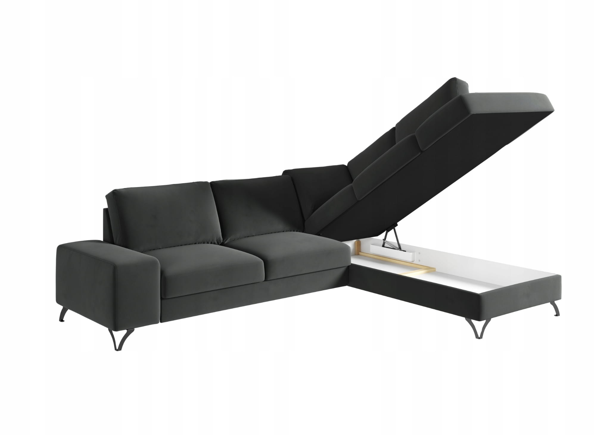Prezentowany układ posiada rozkładaną powierzchnie spania otwieraną za pomocą automatu typu delfin oraz duży pojemnik na pościel umieszczony w otomanie.