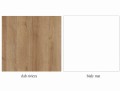 Korpus mebli jest zbudowany z matowej bieli. Wstawki do frontów, to wybarwienie naturalnego drewna czyli ulubiony naszych projektantów, Dąb Riviera. Całość frontów jest wykonana z białej płyty o wysokim połysku, co nadaje meblom charakteru i oryginalności. Frezy frontów pełnią też rolę uchwytów. Szyby w witrynach wykonane są ze szkła hartowanego, w środku półki są również szklane z możliwością podłączenia oświetlenia LED, co wyeksponuje estetyczny środek witryn.