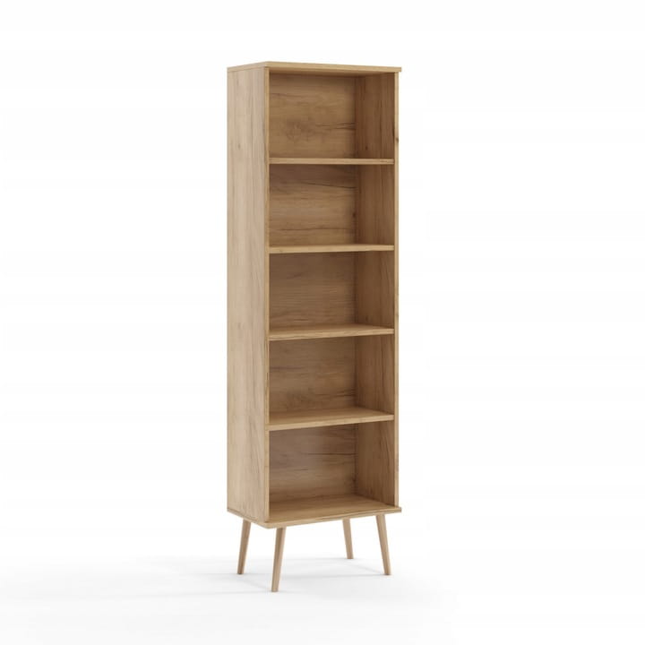 Wnętrze regału wyposażone zostało w 4 półki z czego 2 z regulowaną wysokością, dzięki czemu ustawisz na nim przedmioty dowolnej wysokości. Wysokie nóżki dodają estetyki, a dolna i górna część korpusu może również posłużyć jako miejsce do ustawienia książek czy doniczki z kwiatkiem.