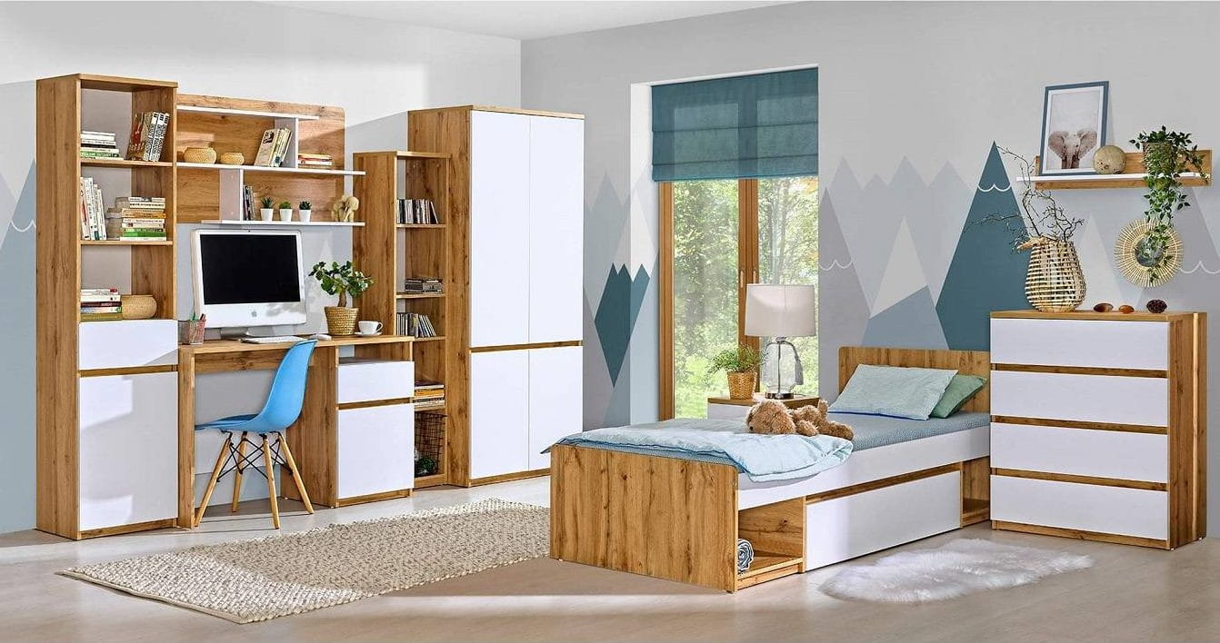 Zestaw Jasnych Mebli do pokoju młodzieżowego z biurkiem i łóżkiem CARO 3