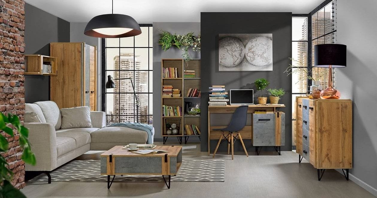 bardzo charakterystyczne meble w stylu loftowym. Ciepły kolor płyty dąb wotan świetnie współgra z szarością płyty beton millenium. Mnogość elementów tej kolekcji sprawia, że każdy znajdzie w niej coś dla siebie. Umebluj swój salon i biuro w dobry stylu.